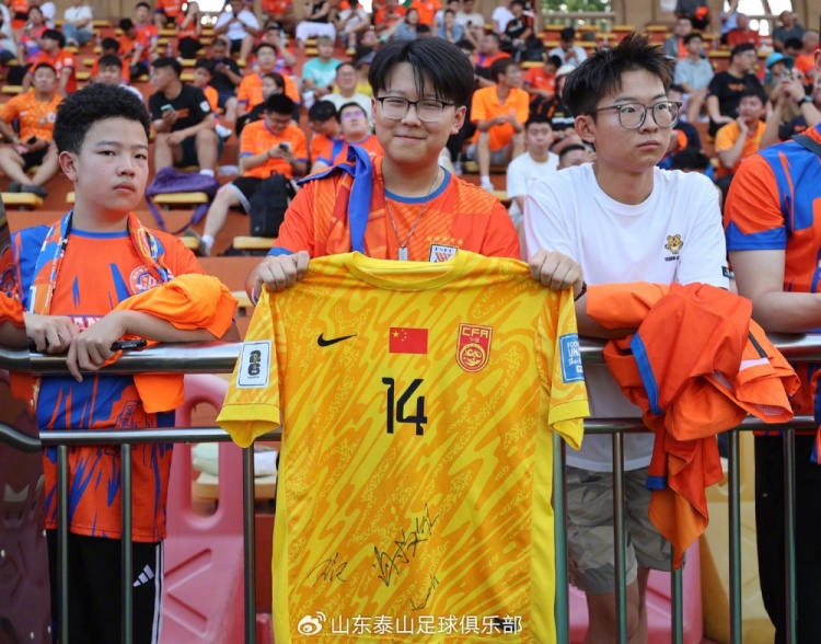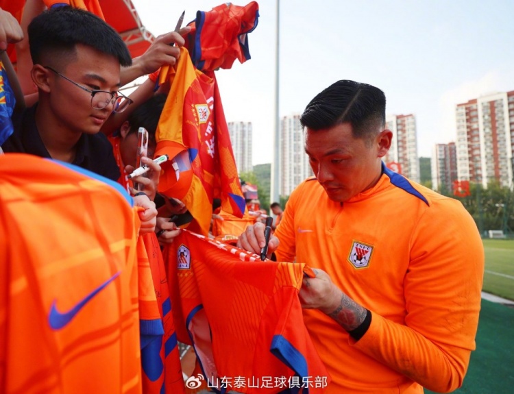 7月16日下午,山东泰山足球俱乐部媒体球迷开放日活动在俱乐部3号训练场地进行。大约200余名球迷朋友以及10多家省内外媒体来到现场观看球队训练。训练结束后,全体队员来到球迷看台下与到场的球迷们合影和签名,教练组组长韩鹏和队员彭啸接受了媒体采访。